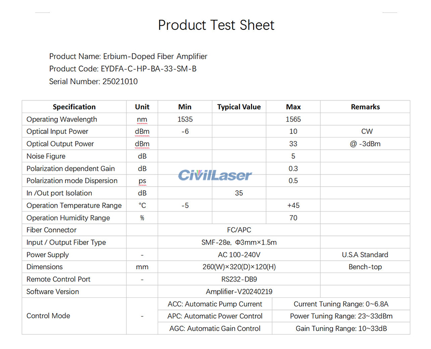 エルビウムドープファイバ増幅器 (EDFA) はエルビウムドープファイバをベースとした光信号増幅デバイスで、光ファイバ通信の最小損失ウィンドウと一致する 1535 ~ 1565 nm の波長範囲で動作します。その中核となる機能には、980 nm または 1480 nm ポンプ光源を使用してエルビウム イオン (Er3+) を励起し、光電変換を行わずに光信号の全光増幅を達成することが含まれます。 1985 年の導入以来、EDFA は光ファイバー通信の中核コンポーネントとなっています。 2022 年には、中国情報通信技術集団 (CICT) などの機関が独自の開発をさらに推進し、インテリジェントな監視用に RS232 通信プロトコルを統合しました。
